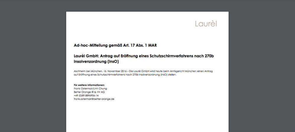 从种种信息看来,Laurèl寻求收购的意向其实很明确,它常年处于财务压力之下,其2015财年的运营收入损失了240万欧元、销售额又环比下跌10.5%至365万欧元。在标的业绩低迷时出手本通常是兼并的好时机,但事情显然已经变得更为复杂。收购一年后,Laurèl近日在官网公布公告,称公司的战略重组投资已经取消。公告提到了曾经的可能性战略投资者——深圳东方时尚资产管理有限公司也将取消投资,Laurèl将迫于负债无法到期偿付,向慕尼黑地方法院申请了保护程序。