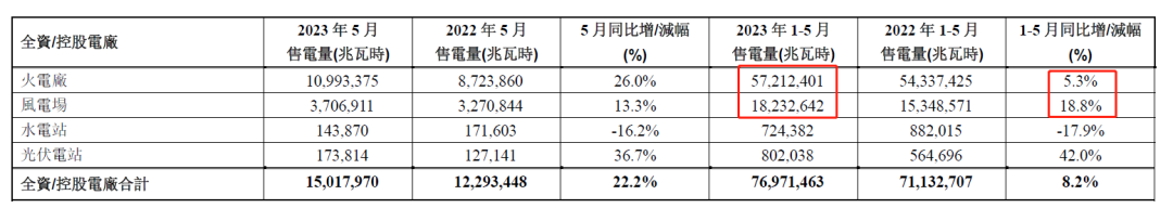 2023年前5月,华润电力附属电厂累计售电量为76971463兆瓦时,同比增长8.2%。其中,火电厂累计售电量为57212401兆瓦时,同比增长5.3%;附属风电场累计售电量为18232642兆瓦时,同比增长18.8%。