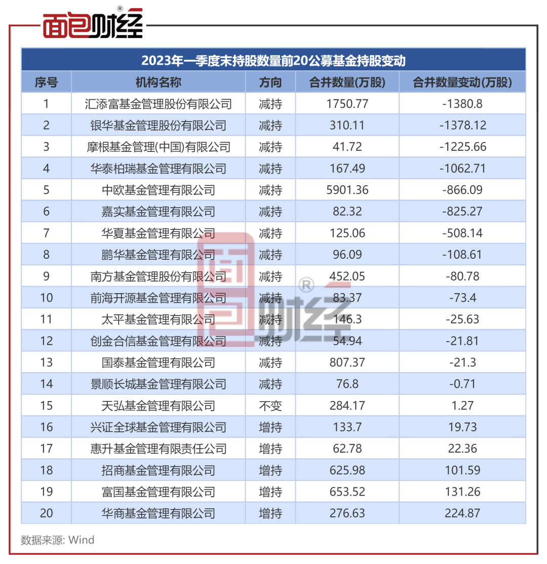 持仓数量排名前20的基金机构中,中欧基金、汇添富基金和国泰基金对牧原股份持仓数量居于前三,一季度均有所减持,汇添富基金、银华基金、摩根基金、华泰柏瑞基金减持数量超1000万股。