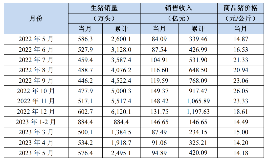 从产销快报来看,2022年5月到10月牧原股份商品猪单位售价持续上涨,由14.87元/公斤上涨至26.05元/公斤。但2022年10月至今公司商品猪单位售价持续下滑,今年5月平均售价已经低至14.18元/公斤。