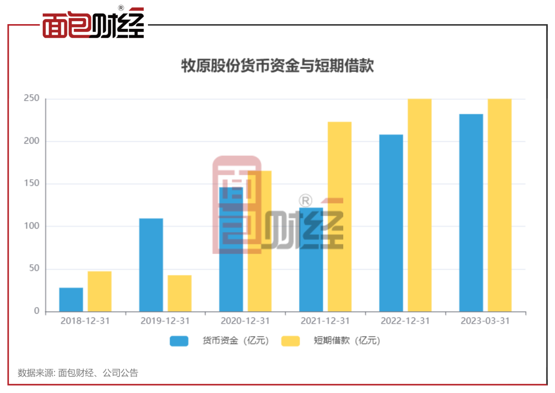 近三年来看,2020年到2022年牧原股份货币资金分别约为145.94亿元、121.98亿元、207.94亿元、2023年一季度末为232.1亿。各报告期末,牧原股份短期借款也呈现大幅上升趋势,分别约为165.32亿元、222.91亿元、291.65亿元、406.64亿元。