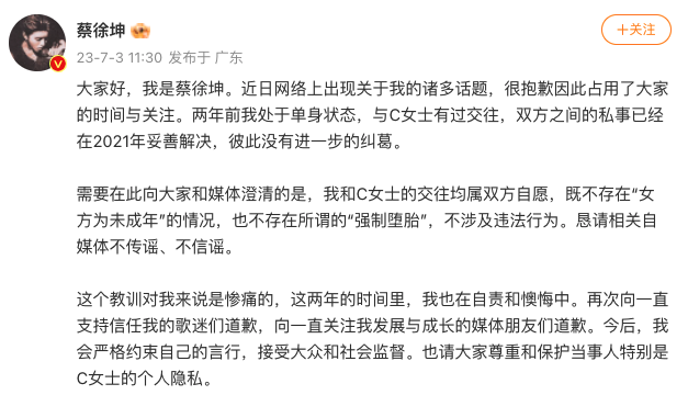 此前,@蔡徐坤 发文回应网传事件称,“很抱歉占用了大家的时间与关注。两年前我处于单身状态,与C女士有过交往,双方之间的私事已经在2021年妥善解决,彼此没有进一步的纠葛”。