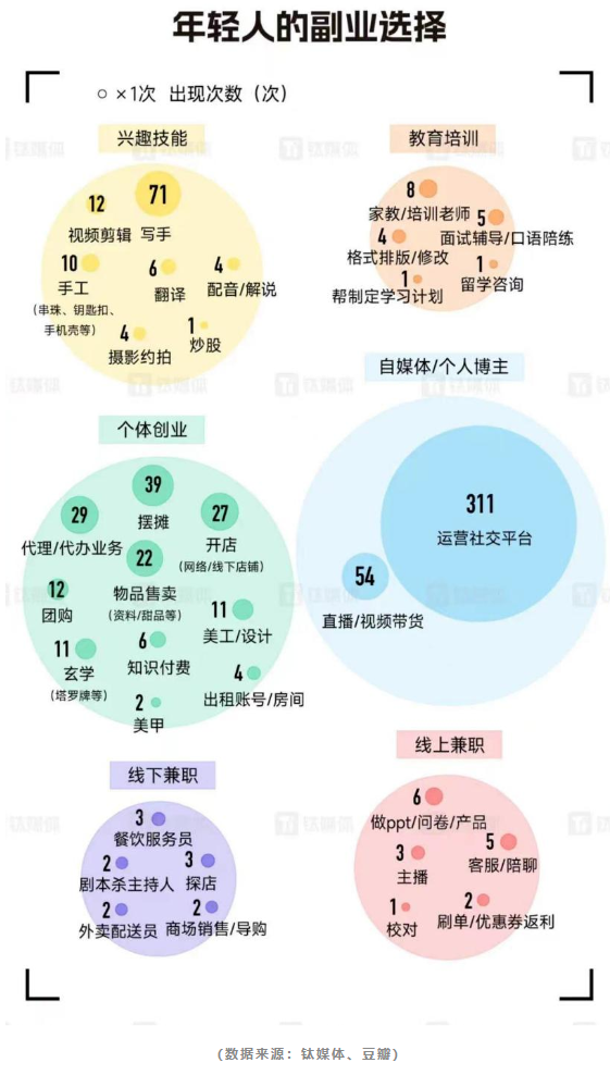 豆豆失败的副业经历并不罕见,这样的故事每一天都在上演。数据显示,目前国内边工作边做副业的年轻人已经超过8000万,其中7成以上都经历过失败。在豆瓣“副业失败的一天”小组(简称败组),有近28万人在分享自己副业的心得和经验,组长在简介里写到“如今失败,未来求败。遍寻天下,但求一败!”。据统计,败组中热度最高的副业是自媒体,在小红书、抖音、快手等平台靠分享视频、图文等吸引流量,达到一定粉丝数量后再寻求变现;其次是写手,包括写连载小说、推文、书评等;此外还有视频剪辑、翻译、家教培训、摄影约拍、摆摊、闲鱼等等,副业选择可谓五花八门。