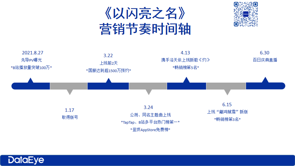 DataEye研究院整合了内部数据、点点数据、《以闪亮之名》官方数据发现:2021年8月《以闪亮之名》便开始筹备预热;今年1月17日取得版号;3月24日上线游戏;4月携手洛天依上线新歌《灼》;6月开展百日庆典直播。宏观而言,每隔3周就有一次营销动向。