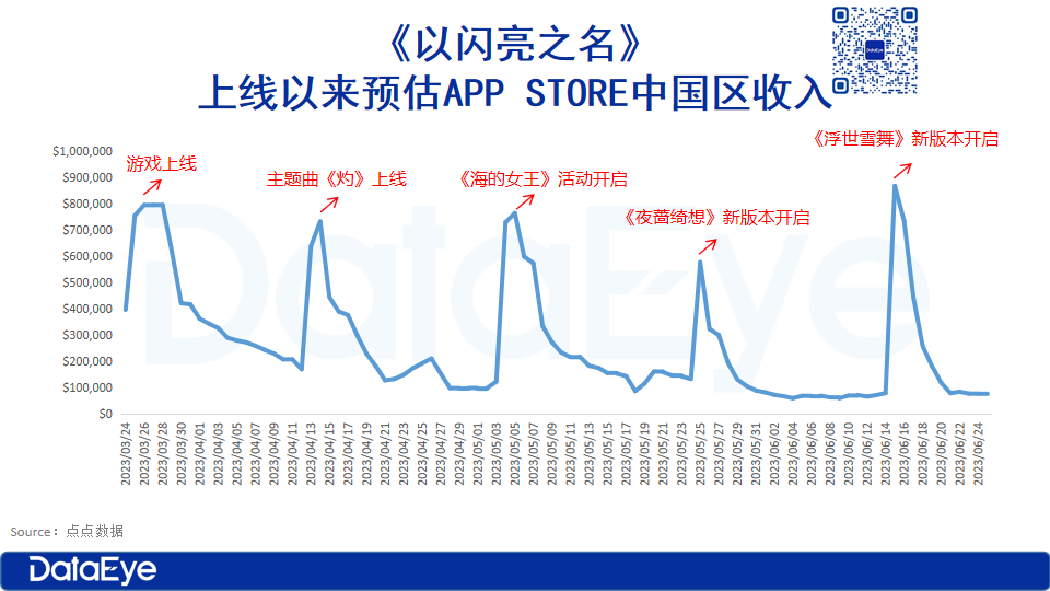 《以闪亮之名》国内上线以来,iOS端预估收入出现五次飙升,基本与上述营销节奏吻合。
