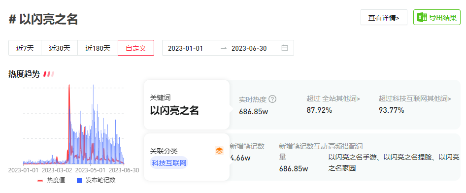 涵盖小红书、微博、短视频等平台,以小红书为例,新榜旗下小红书数据工具——新红数据显示:今年以来《以闪亮之名》实时热度超过680万,热度超过93.65%的互联网其他词。邀请各个领域的头部KOL进行营销推广,从对应受众的兴趣内容出发,输出对应的PUGC内容,在各大社媒完成了一次“包场式宣发”。可见其当时的投入和野心。