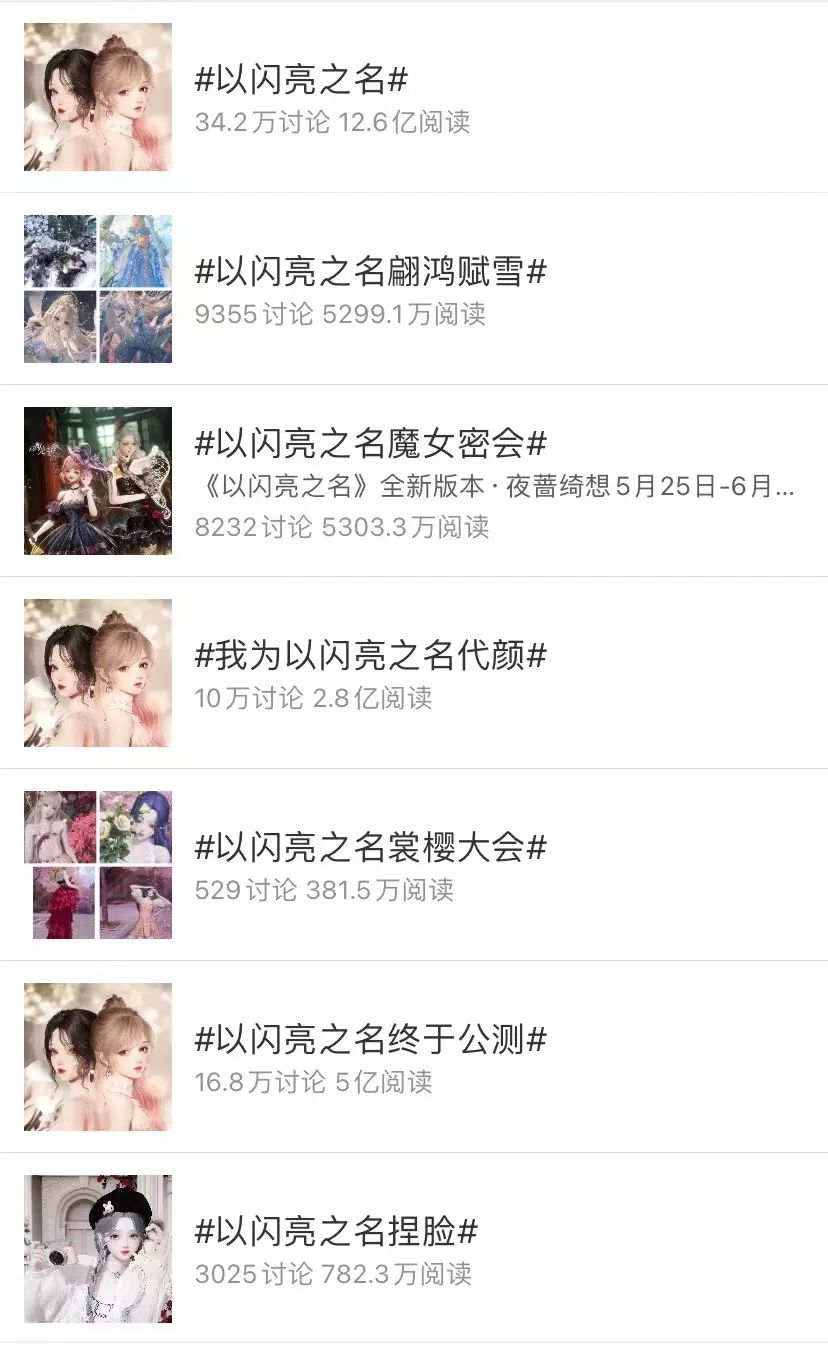用户在各大社媒分析游戏玩法、秀出游戏穿搭、分享捏脸方案、展示家园DIY成果。目前在微博平台#以闪亮之名#话题已突破12亿阅读,活动#我为以闪亮之名代颜#阅读达2.8亿,其最新版本「翩鸿赋雪」阅读量突破5000万。