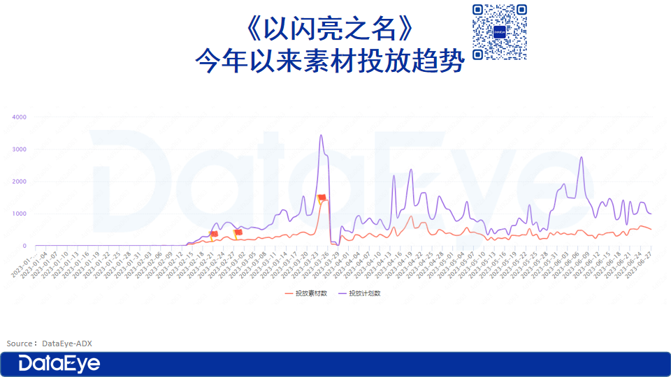 直到2023年1月获得版号、2月才投放出现小高峰。DataEye-ADX数据显示,产品在定档前的测试阶段素材较少,日均在150组左右,在公测当天,投放量激增,日投放量达1200组以上。上线后,日常投放量稳定,在450组左右,在版本更新前或有活动时,适当增加投放量。
