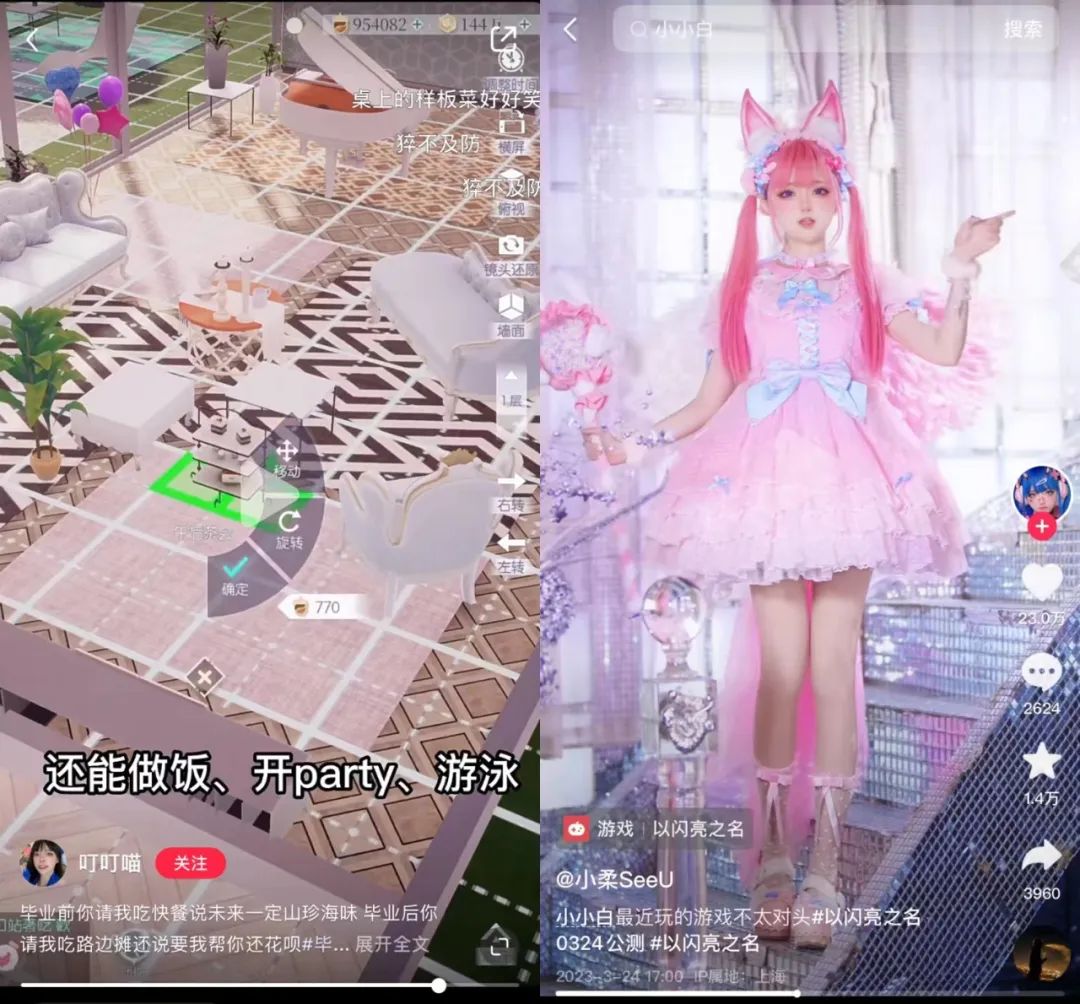 在抖音,擅长仿妆、变装、Cosplay的KOL「小柔SeeU」,则通过对《以闪亮之名》中妆造的高度还原,向女性用户们传递换装玩法、服装华丽、游戏自由度高等特点。
