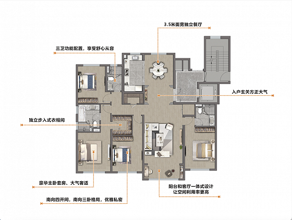 最大的亮点在于突破尺度框架——除了超大方正的入户玄关、3.5米面宽的独立餐厅空间,迭代了阳台设计,直接打通阳台和客厅后,一体化无阻隔,延展了家庭活动空间,而阳台仿佛是多了横向“+1的空间感”设计,让利用率变得更高。