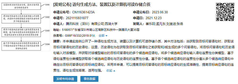 国家知识产权局网站披露,6月30日,腾讯科技(深圳)有限公司与西湖大学共同申请的“语句生成方法、装置以及计算机可读存储介质”专利公布。