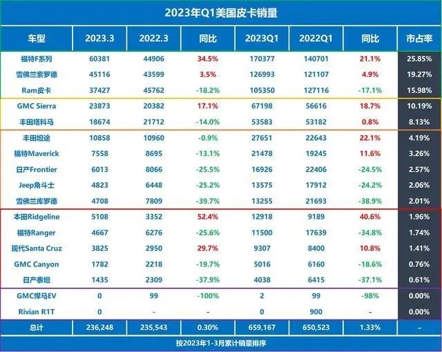 今年3月,美国市场销售皮卡新车236248辆,相比2022年3月235543辆的成绩,仅同比上涨0.3%;1-3月累计销售新车659167辆,较2022年同期上涨了1.33%。事实上,2020年以来,美国皮卡销量已经连续三年同比下降,销量较2019年跌去近10%。