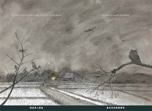 在中国,《不畏风雨》这首诗在1939年就以《北国农谣》为题译介到了中国,译者是著名的日本文学翻译家钱稻孙。“不畏风兮/不畏雨/耐得寒冬/耐得暑”,整首诗翻译得古雅、整饬。后来不同研究者和民间的翻译有无数个版本,2015年,由吴菲翻译的宫泽贤治诗集《春天与阿修罗》在中国首度出版,其中即以《不畏风雨》为题收录了这首诗。这次后浪出版公司引进了获得过奥斯卡金像奖提名的日本动画导演山村浩二的绘本《不畏风雨》,山村浩二用自己精微的笔触来描绘宫泽贤治的的“心象素描”,而汉语的译者,是毕业于北大外文系的民谣歌手程璧。