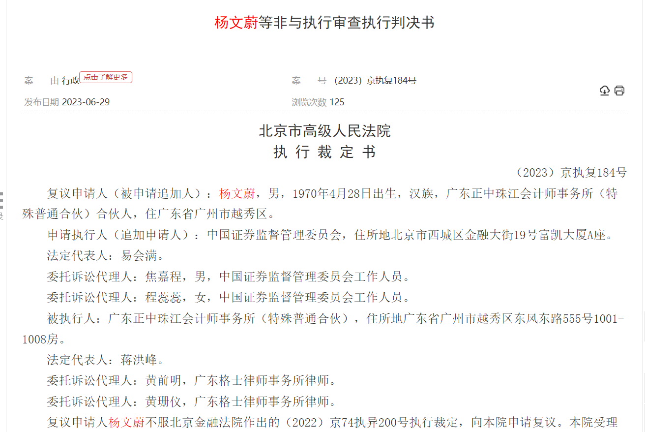 但是这笔罚款还未落实。中国证监会与广东正中珠江会计师事务所(特殊普通合伙)行政非诉执行一案(执行依据:(2021)京74行审11号行政裁定书)过程中,中国证监会向北京金融法院提出追加杨文蔚为被执行人的申请。