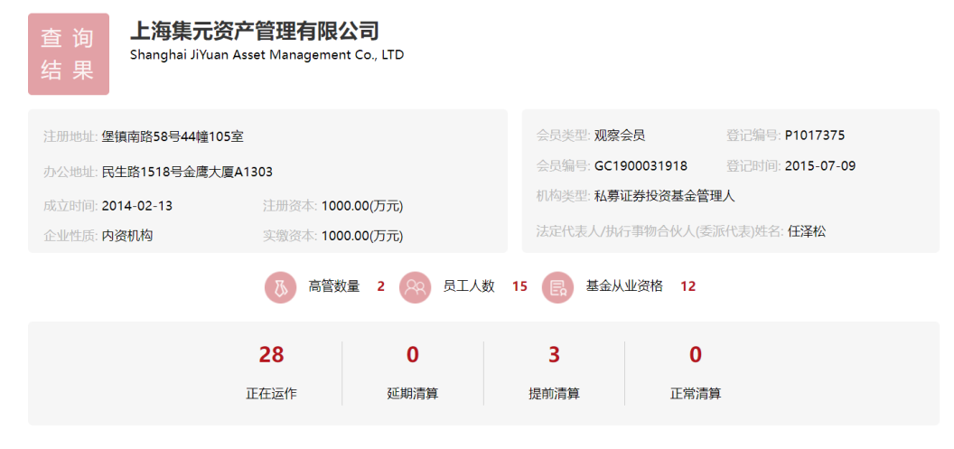 证券投资基金业协会数据显示,集元资管目前共有15名员工,其中有12人有基金从业资格。