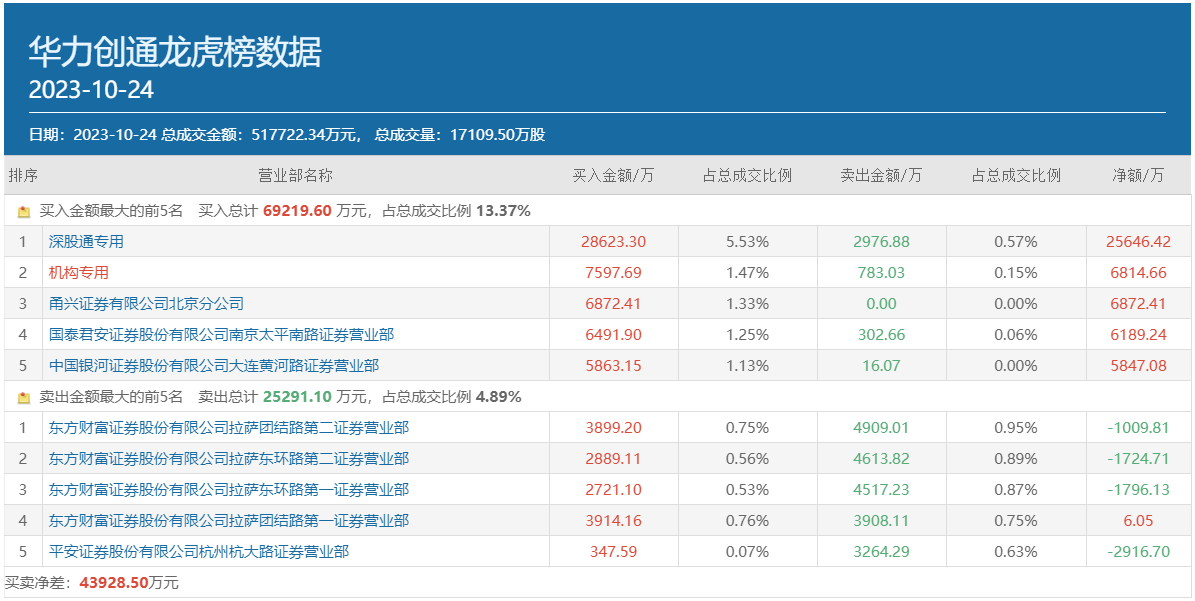 盘后披露的龙虎榜数据显示,华力创通买方前五个席位合计的买入金额高达6.92亿元,占该股当日总成交额的比例为13.37%。