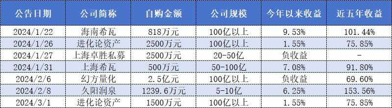事实上,除了进化论资产以外,今年以来还有其他多家私募也曾陆续宣布自购,其中知名百亿量化巨头幻方量化的自购金额更是高达2.5亿元。