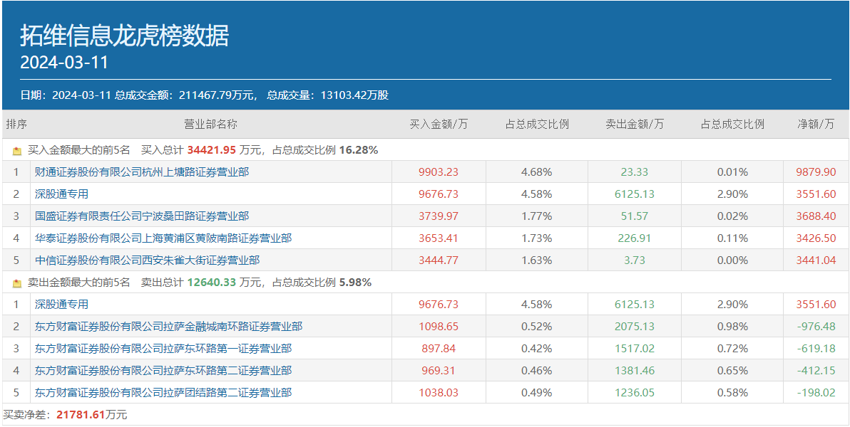 3月11日,拓维信息(002261.SZ)成功涨停,全天成交21.15亿元,截至收盘依然有14.69万手封单。