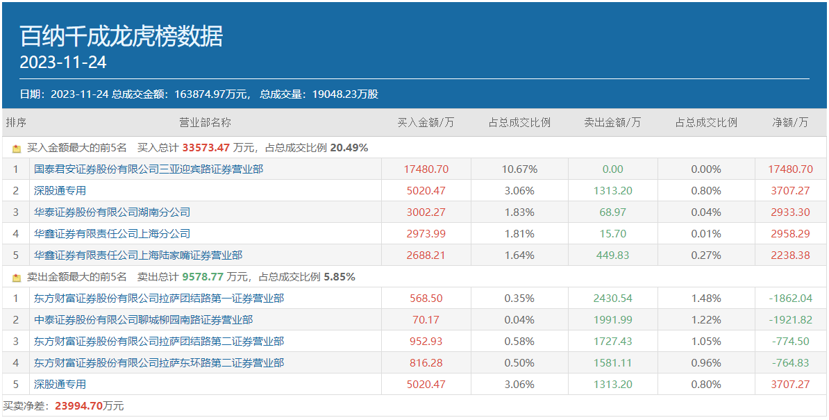 值得一提的是,除了佛山系以外,11月24日百纳千成还获得了北上资金的青睐,深股通专用席位净买入该股3707.27万元;另有知名游资常用席位华泰证券湖南分公司以及华鑫证券上海分公司也均出现在该股买方前五位中,买入金额分别为3002.27万元和2973.99万元。