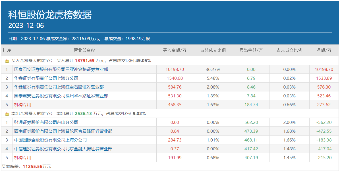 12月6日,佛山系的常用席位国泰君安证券三亚迎宾路同时出现在两只个股龙虎榜买方榜首,分别是科恒股份(300340.SZ)和索菱股份(002766.SZ),买入金额分别为1.02亿元和0.93亿元。