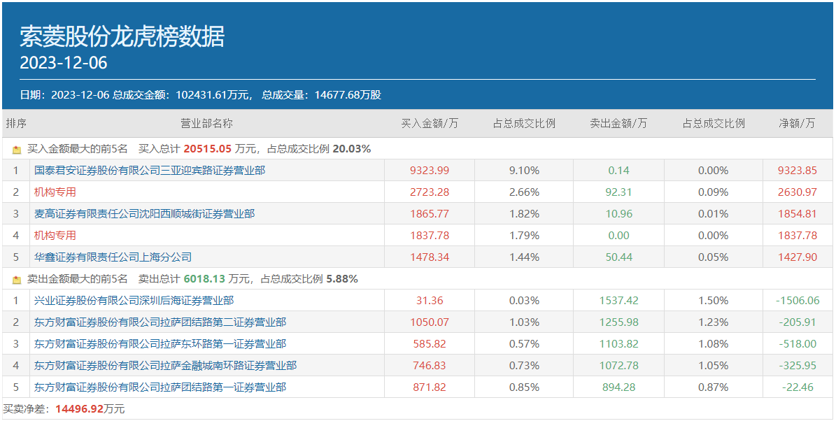 值得一提的是,除了佛山系以外,12月6日索菱股份还获得了机构资金的青睐,有两个机构专用席位出现在该股买方前五位中,合计的买入金额为4561.06万元,占该股当日总成交额的比例合计为4.45%。