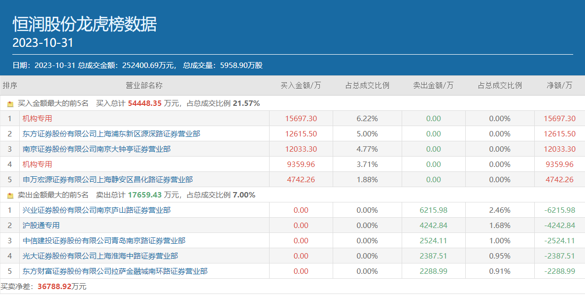 值得一提的是,虽然股价高位跌停,但是恒润股份当天却依然吸引到了多路资金的积极豪买,盘后披露的龙虎榜数据显示,该股当日买方前五个席位合计的买入金额高达5.44亿元,占该股当日总成交额的比例为21.57%。