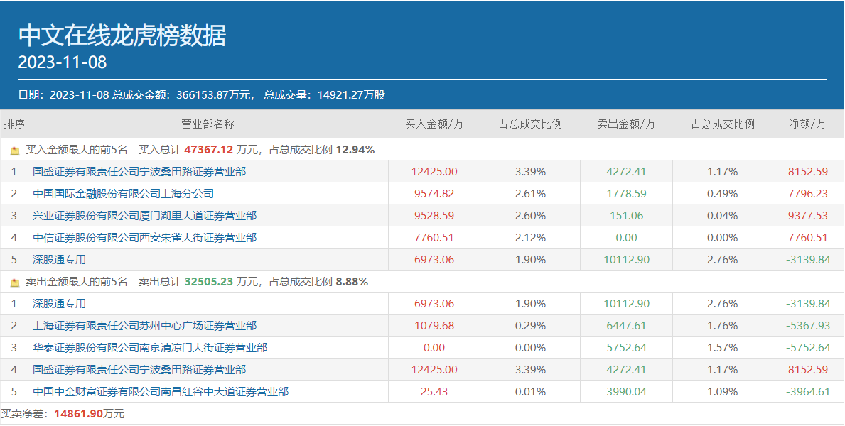 具体来看,知名游资宁波桑田路的常用席位国盛证券宁波桑田路高居中文在线买方榜首,买入金额为1.24亿元,同时卖出4272.41万元;中国国际金融上海分公司以及兴业证券厦门湖里大道分列买方第二和第三位,买入金额分别为9574.82万元和9528.59万元;另有方新侠的常用席位中信证券西安朱雀大街位列买方第四位,买入金额为7760.51万元。