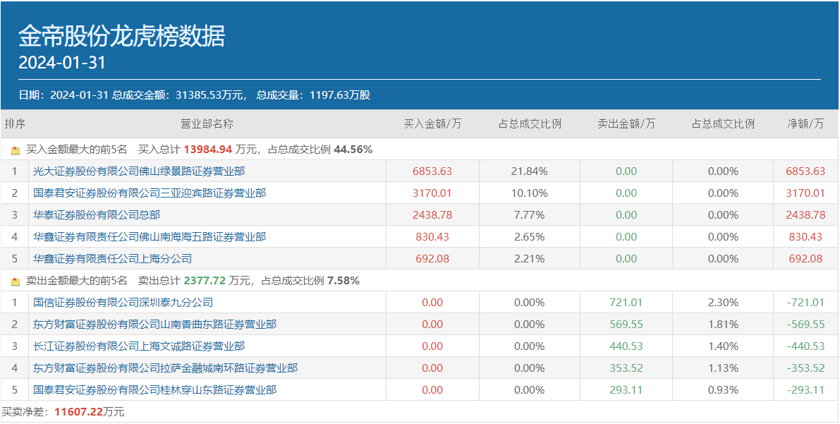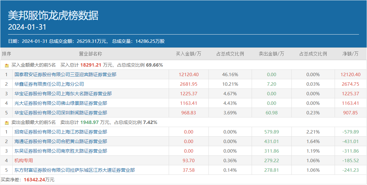 其中,上榜金额最多的当属佛山系,龙虎榜数据显示,当日佛山系的两大常用席位国泰君安证券三亚迎宾路和光大证券佛山绿景路分别出现在美邦服饰(002269.SZ)买方第一和第四位,买入金额分别为1.21亿元和1163.41万元;同时,上述席位还一同出现在金帝股份(603270.SH)龙虎榜买方前两位,买入金额依次分别为3170.01万元和6853.63万元。