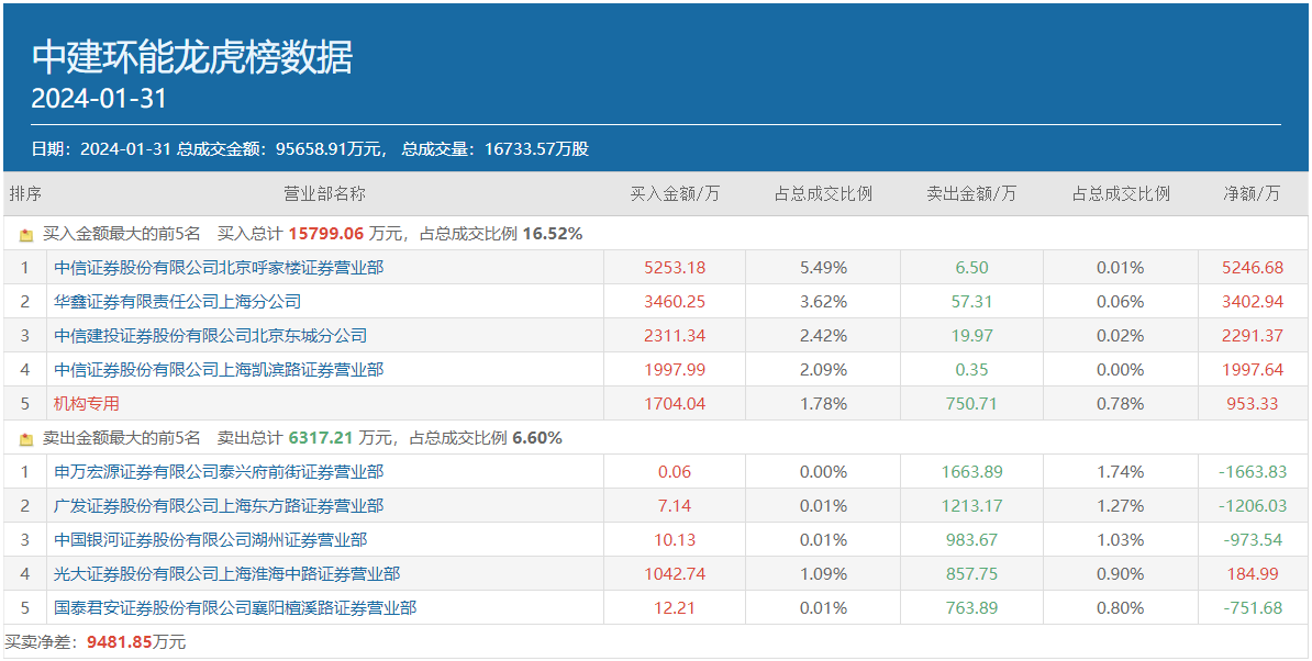 知名游资呼家楼1月31日也动用了两大常用席位,分别是中信证券北京呼家楼和中信建投证券北京东城分公司,上述两个席位分别出现中建环能(300425.SZ)买方第一和第三位,买入金额分别为5253.18万元和2311.34万元。