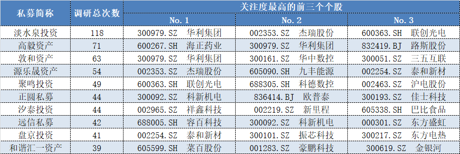 表格:下半年以来调研次数排名前十位的百亿私募关注度前三个股名单