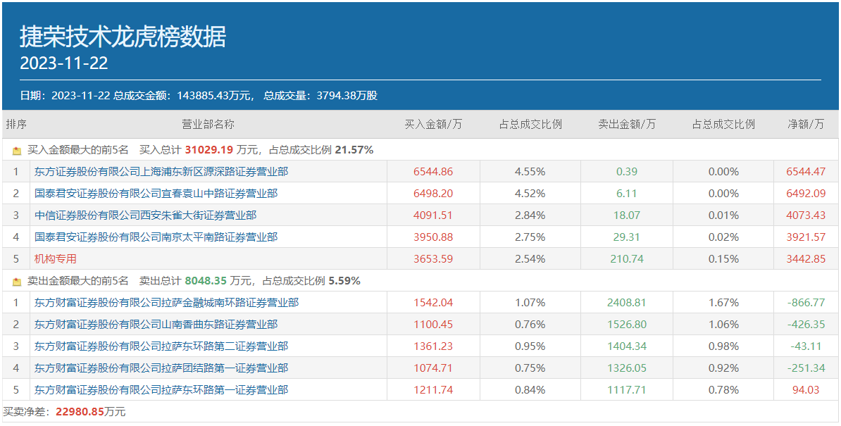 值得一提的是,除了以上三大知名游资罕见同框以外,11月22日捷荣技术还吸引到了机构资金的积极参与,有一个机构专用席位出现在该股买方第五位,买入金额为3653.59万元。