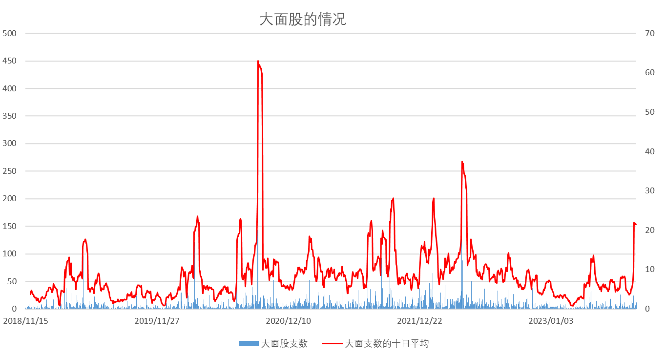 界面新闻梳理发现,自2020年以来,两市大面股(即单日爆亏的股票,本文以“当日收盘价/当日开盘价-1<-11%”为统计标准)数量居高不下。2020年以前绝大部分时间每天只有三到四只的大面股。但是2020年以后,整个市场平均每天的大面股数量在十只左右,甚至经常出现单日大面股数量超过50只的情况。