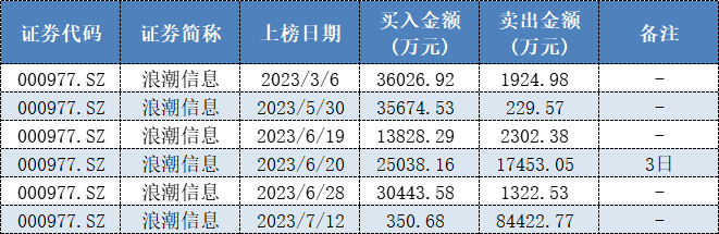 表格:国泰君安证券上海江苏路近期现身浪潮信息龙虎榜情况