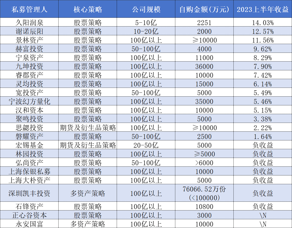 表格:2022年宣布自购的23家私募今年上半年的业绩表现情况