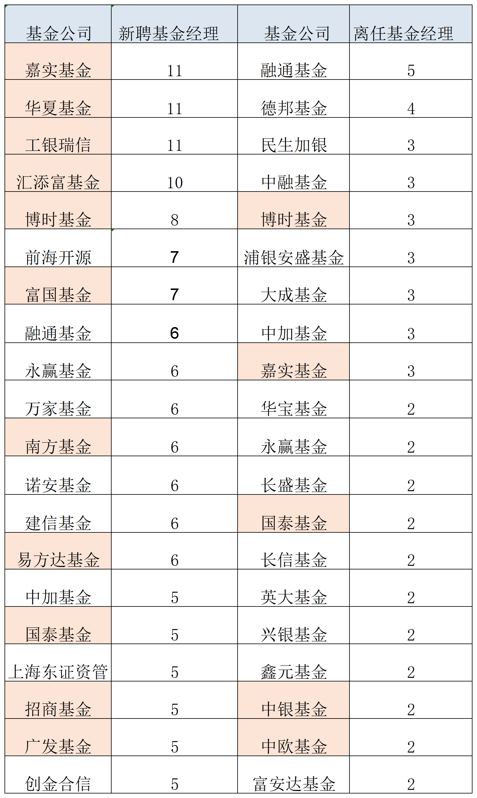 Wind数据显示,今年上半年,共有148位基金经理离任,同时也有328位基金经理被新聘为基金经理。其中,嘉实、华夏、工银瑞信均新聘任了11位基金经理,位列前三位。而融通、德邦、民生加银的离任基金经理分别为5、4、3位,位列前三。