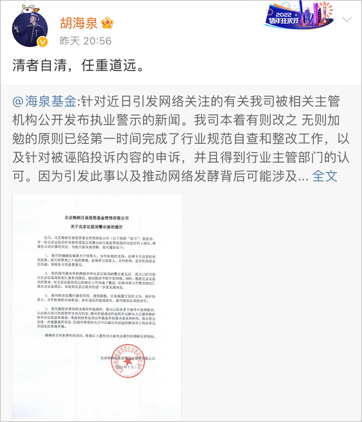 对此,海纳百泉基金官方微博“海泉基金”迅速发布声明,称第一时间完成了行业规范自查和整改工作。胡海泉也在7月1日转发该声明,并配上了8个字:“清者自清,任重道远”,主打一个态度恳切。