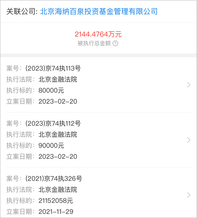 公开信息显示,今年3月7日,海纳百泉基金新增一则被执行人信息,被强制执行2144万余元;今年2月,海泉基金被北京金融法院分别执行8万元和9万元;2021年11年29日,海泉基金被执行标的2115万余元。