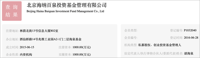 公开资料显示,海纳百泉基金注册资本1000万人民币,主要负责私募股权和创业投资基金管理。目前中国基金协会的网站显示,在管基金数为8个。