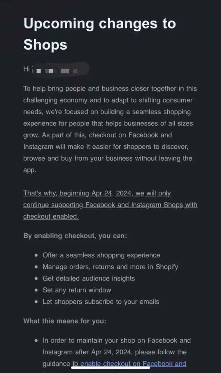 3、2024年4月24日。明年4月24日后,未启用Facebook或Instagram站内结账功能的小店将无法访问,包括通过消息结账的店铺,以及引导用户前往独立站完成购物的店铺都无法再访问。