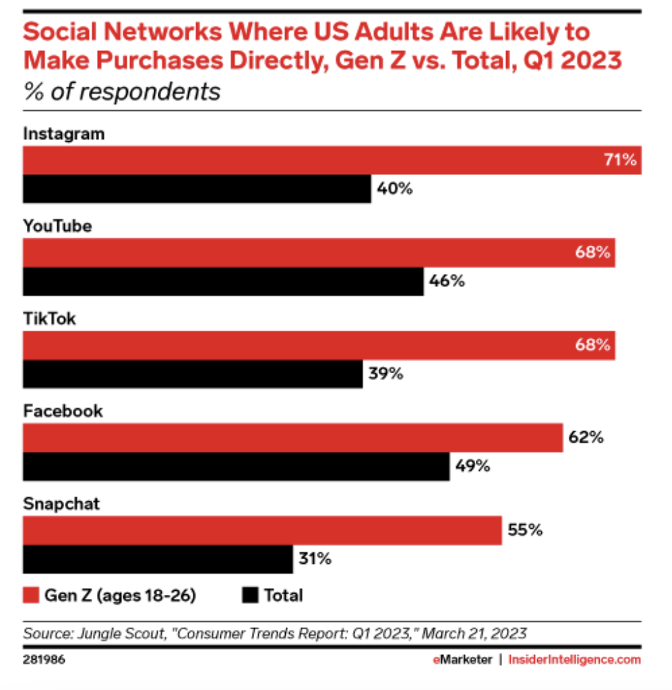 Insider Intelligence进一步列出,Facebook目前(在所有社媒平台中)拥有最多的社交买家,预计今年将有6570万人在该平台进行购买——虽然买家数量增长(3.5%)相比去年(11.9%)有所放缓。Instagram的社交买家数量增长速度则稍快,为4.9%,今年将达到4300万人。