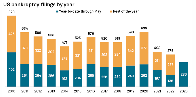 April adds 54 more US corporate bankruptcies; 2023 filings highest since 2010. (S&P Global)