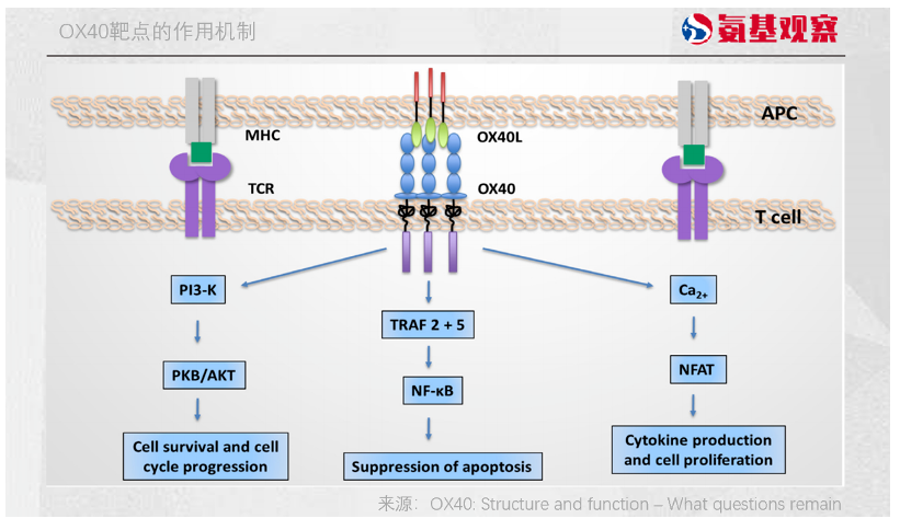 该靶点的具体作用是,APC细胞将抗原呈递给T细胞,使得其活化,随后T细胞表面的OX40与其配体OX40L结合,启动下游信号,延长活化T细胞存活时间。