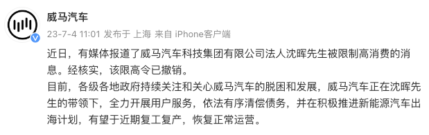 7月4日,威马汽车官博发布声明称,“近日,有媒体报道了威马汽车科技集团有限公司法人沈晖先生被限制高消费的消息。经核实,该限高令已撤销。”声明称,威马汽车正全力开展用户服务,依法有序清偿债务,并在积极推进新能源汽车出海计划,有望于近期复工复产,恢复正常运营。
