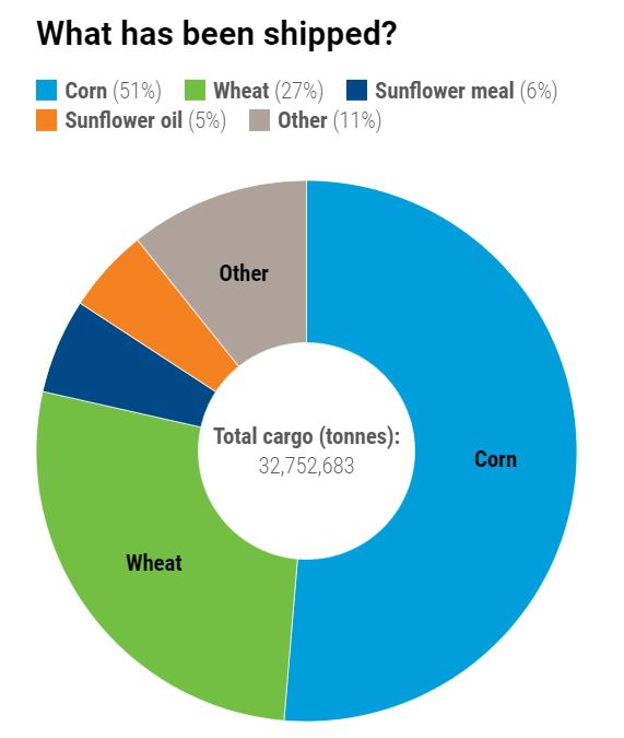 乌克兰和俄罗斯都是全球重要的粮食出口国,两国分别与土耳其和联合国达成黑海运粮协议后,乌克兰粮食得以从三个黑海港口出口,有助于稳定全球食品价格。从去年7月至今,黑海运粮通道运输了3275万吨粮食,其中51%为玉米,27%为小麦。
