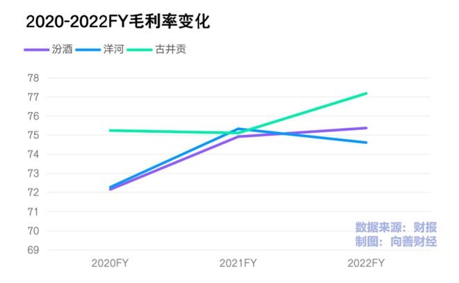 整体来看,山西汾酒近三年的毛利率十分稳定,分别为72.15%、74.91%、75.36%。在浓香型跟酱香型的步步紧逼下,清香型的处境尤为艰难,以河南这种白酒消费大省为例,2021年,河南酱香型白酒市场占比超过40%。