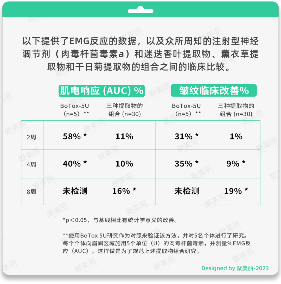 临床评估显示,这三种组合物抑制肌肉收缩的效果虽然不及类肉毒杆菌素,但能够使前额、鱼尾纹等动态皱纹得到显著改善。