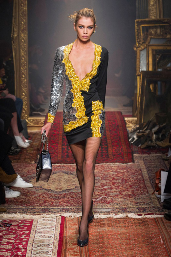 到了秋冬季时,加长加厚的款式让80年代的特征有了更多发挥的空间。Acne Studios展现着闪亮的条纹长袍材质秀场演化为80年代的迪斯科舞厅;Saint Laurent做得更加极致,肩上炸开来的装饰物,以及无限贴身显身材的礼裙,带来富家女鼎盛的物质感;而Moschino则演绎朋克气息十足的皮革和铆钉、经典的皮革海军帽、交际舞会的蓬蓬裙等……