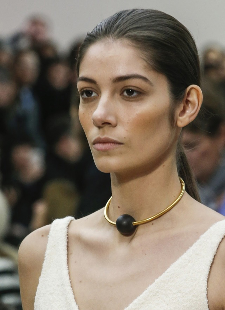 再后来,常见于古罗马古希腊的战士铠甲也被作为灵感来源,带有金属材质的Choker被设计了出来,更粗放更摩登。除了金属材料,透明材质也是随后设计师们塑造摩登版 Choker 乐于尝试的材料。