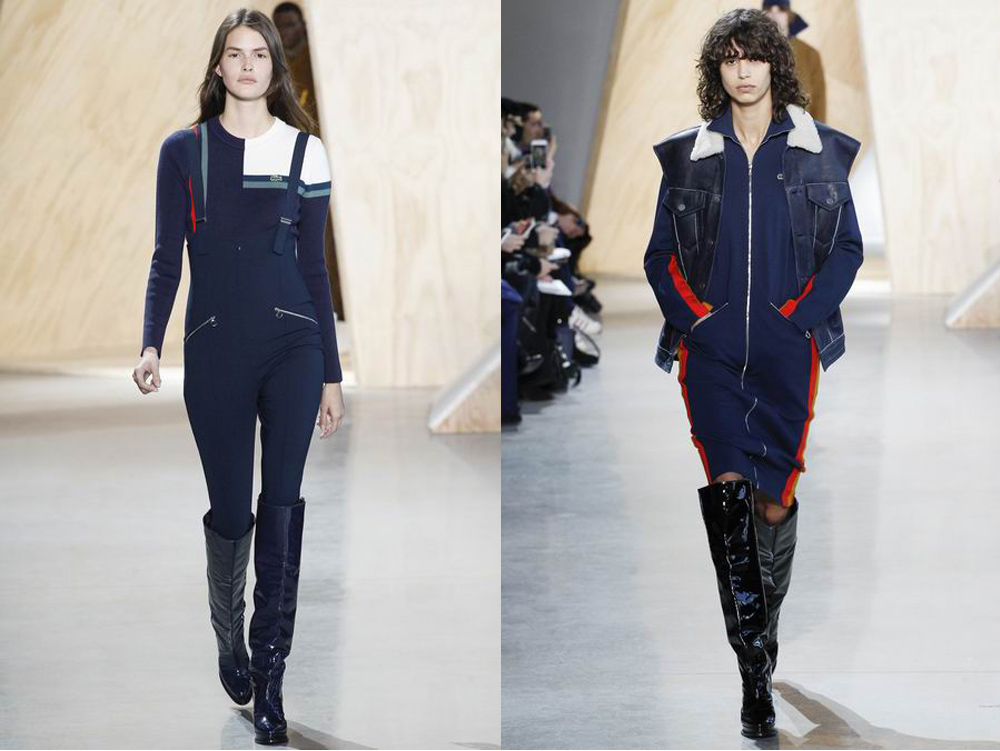 Lacoste是其中一个很好的例子,作为一个体育传统知名品牌,今年它所开发的系列融合了更多的材质和款式。漆皮、亮皮、绒面料子的加入,它似乎不只是印象中那件胸口刺绣着一只小鳄鱼的Polo衫那么简单,修身的针织连体裤搭配及膝的长筒靴、高反光的面料做成的长款帽衫底下还搭配了一条运动裤、深蓝色的绒面料子更迎合了今年的流行趋势……这似乎更像带有运动气息的时装而非运动便装。