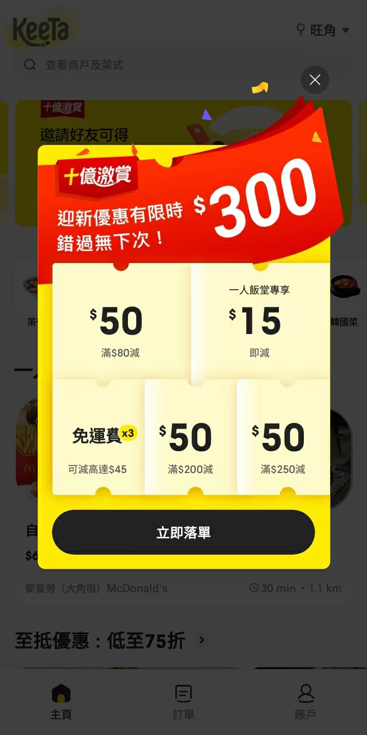 在用户端,KeeTa向新注册用户推出合计300港元的优惠券,其中包括三张消费不同额度的满减券,“一人食”立减券,以及三张运费减免券。